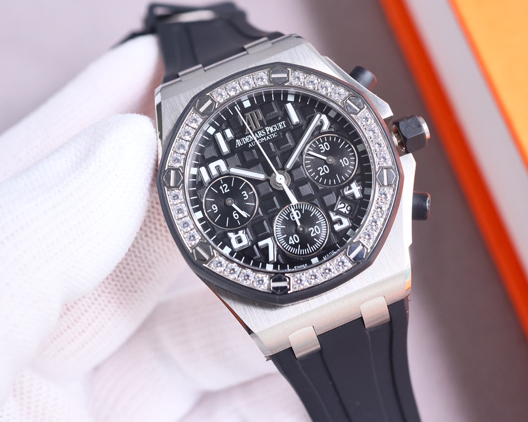 Official watches are in high demand and popular models are hard to come by AP Royal Oak 26048 Offshore 37 Love Chronograph Mechanical Watch 1. The shell sleeve is fully stretched according to the original mold opening details 2. The "cookie texture" on the plate surface with a three-dimensional and neat appearance is exactly the same as the original 3. The original structure makes the entire watch thinner and more harmonious 4. The ring opening adopts the original setting technique of imported diamonds, which makes it brighter and has smaller gaps 5. The crown is made of hexagonal stainless steel, and the top is brushed and polished The 6-digit small seconds function of the 7750 movement is consistent 7. The watch crystal is made of imported sapphire glass 8. The original mold details of the watch case have undergone multiple grinding and sandblasting processes 9. It is paired with an original molded imported fluororubber watch strap The 10-ring opening and the original molded rubber wrapping on the ground restore the details to the greatest extent 10. The header design is consistent with that of the counter and can be slightly adjusted The unique octagonal appearance also features Audemars Piguet's distinctive design style, integrating the elegant style of ladies into it