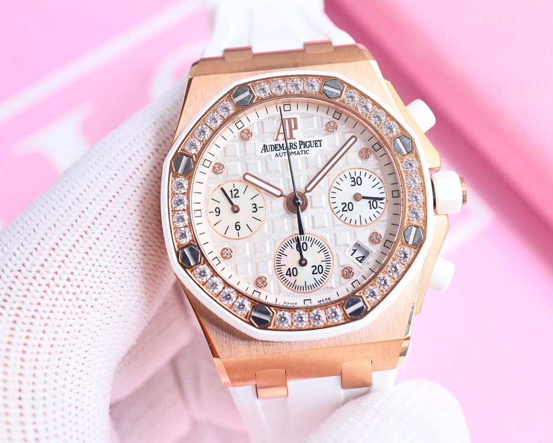 Classic masterpiece Official watches are in high demand and popular models are hard to come by AP Royal Oak 26048 Offshore 37 Love Chronograph Mechanical Watch 1. The shell sleeve is fully stretched according to the original mold opening details 2. The "cookie texture" on the plate surface with a three-dimensional and neat appearance is exactly the same as the original 3. The original structure makes the entire watch thinner and more harmonious 4. The ring opening adopts the original setting technique of imported diamonds, which makes it brighter and has smaller gaps 5. The crown is made of hexagonal stainless steel, and the top is brushed and polished The 6-digit small seconds function of the 7750 movement is consistent 7. The watch crystal is made of imported sapphire glass 8. The original mold details of the watch case have undergone multiple grinding and sandblasting processes 9. It is paired with an original molded imported fluororubber watch strap The 10-ring opening and the original molded rubber wrapping on the ground restore the details to the greatest extent 10. The header design is consistent with that of the counter and can be slightly adjusted The unique octagonal appearance also features Audemars Piguet's distinctive design style, which integrates the elegant style of ladies and is deeply loved by female celebrities