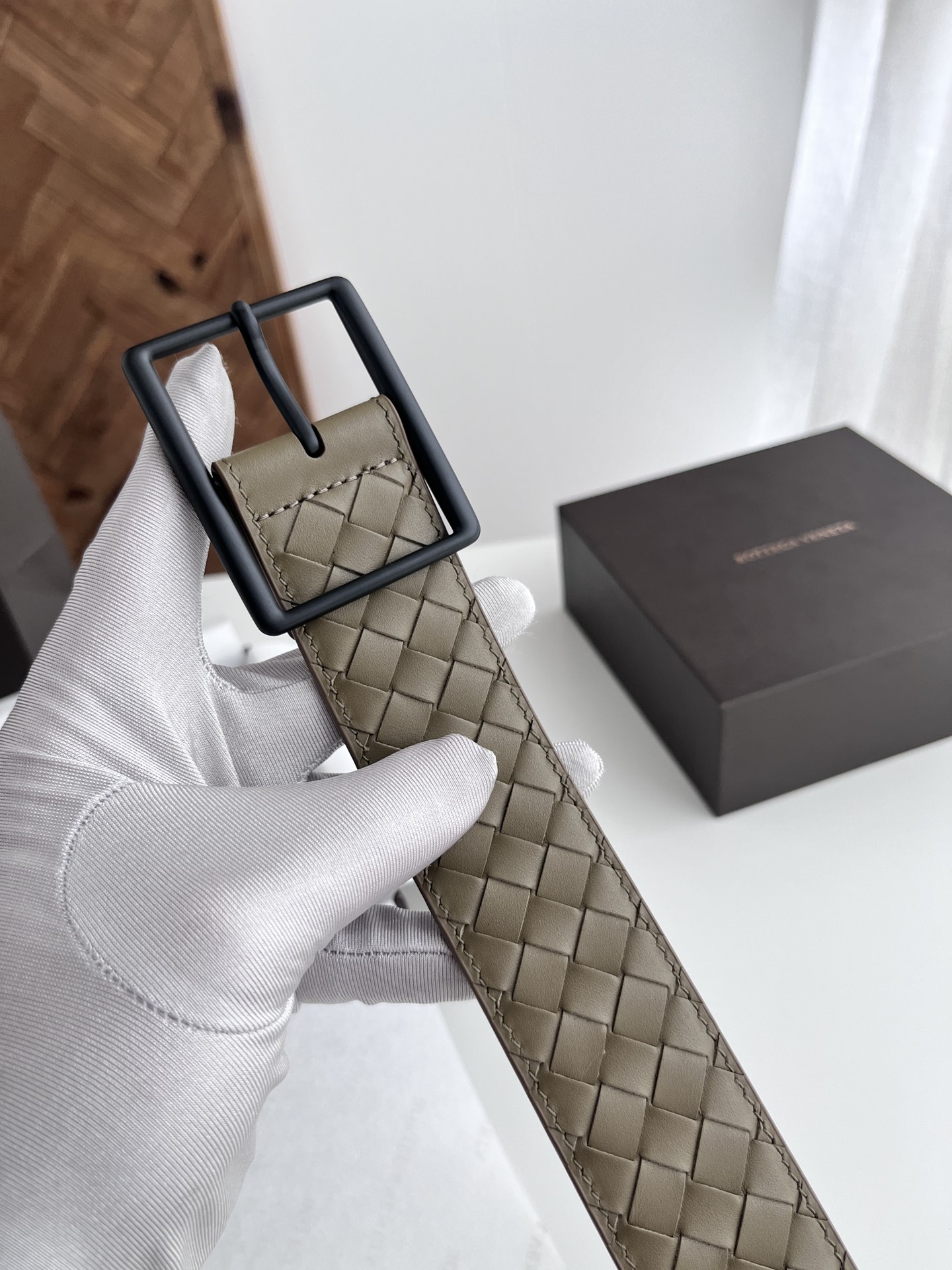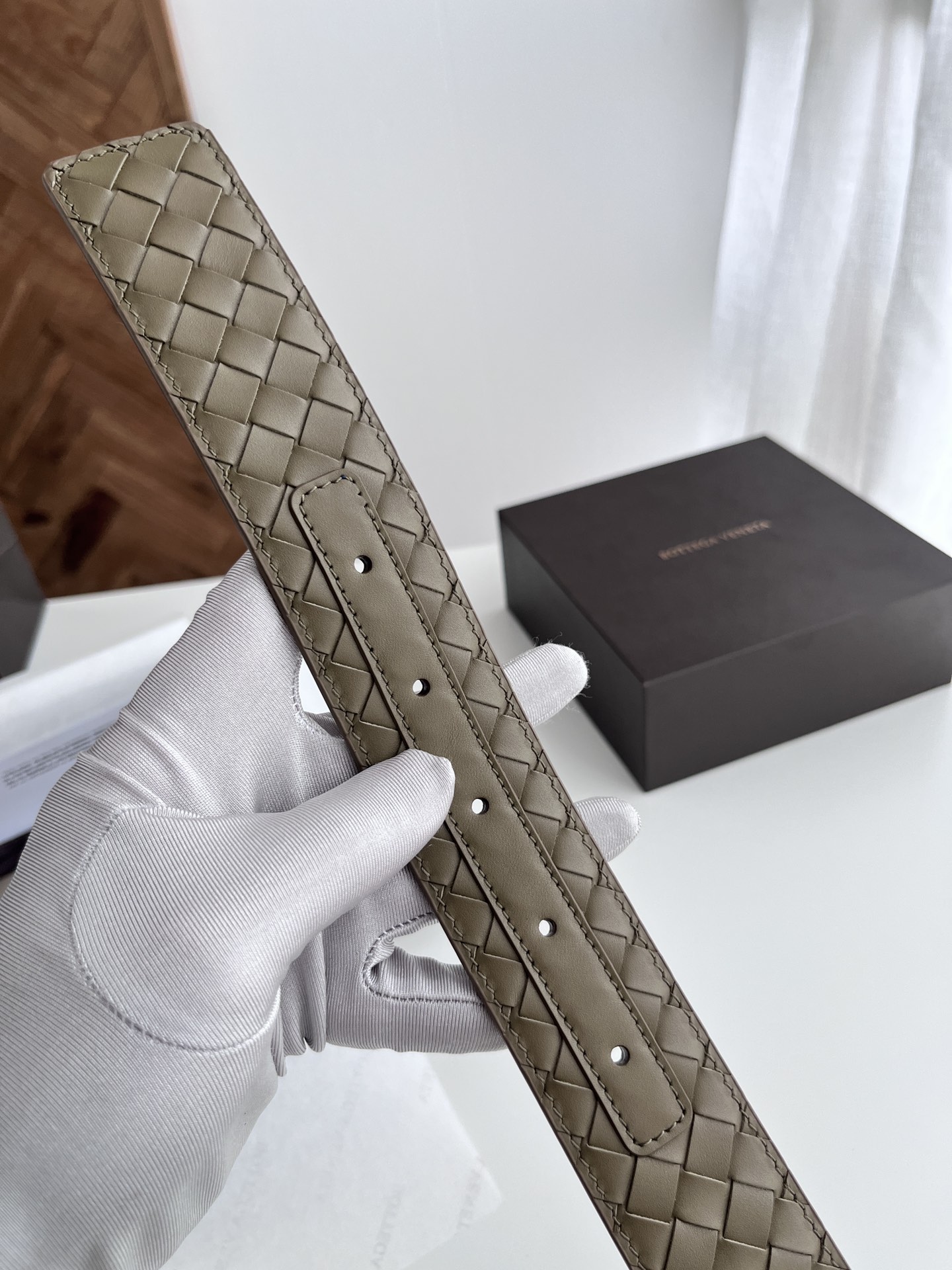 BV top-quality 2024 new wide men's belt, handcrafted with small checkered intrecciato piccolo braided Italian calfskin, paired with vacuum gun-colored pin buckle holes. Newly designed belt width 4.0cm. Color: military green