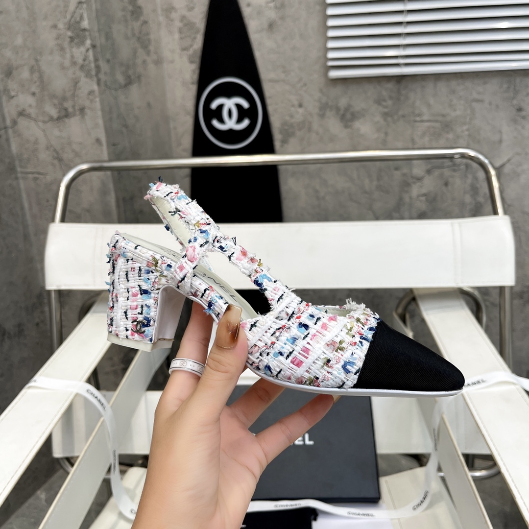 Factory price ???? Women shoes Women CHANEL latest collection, Thick-heeled square toe multicolor versatile high-heeled backheel women's sandals. Material: The upper is made of imported full-grain mixed sheepskin combined with silk satin, the lining is mixed sheepskin, and the sole is Italian imported cowhide. Size: 35-39. Heel height :3.5-6cm. Price size: 34-43 (34 40 41 42 43 custom-made). Chanel