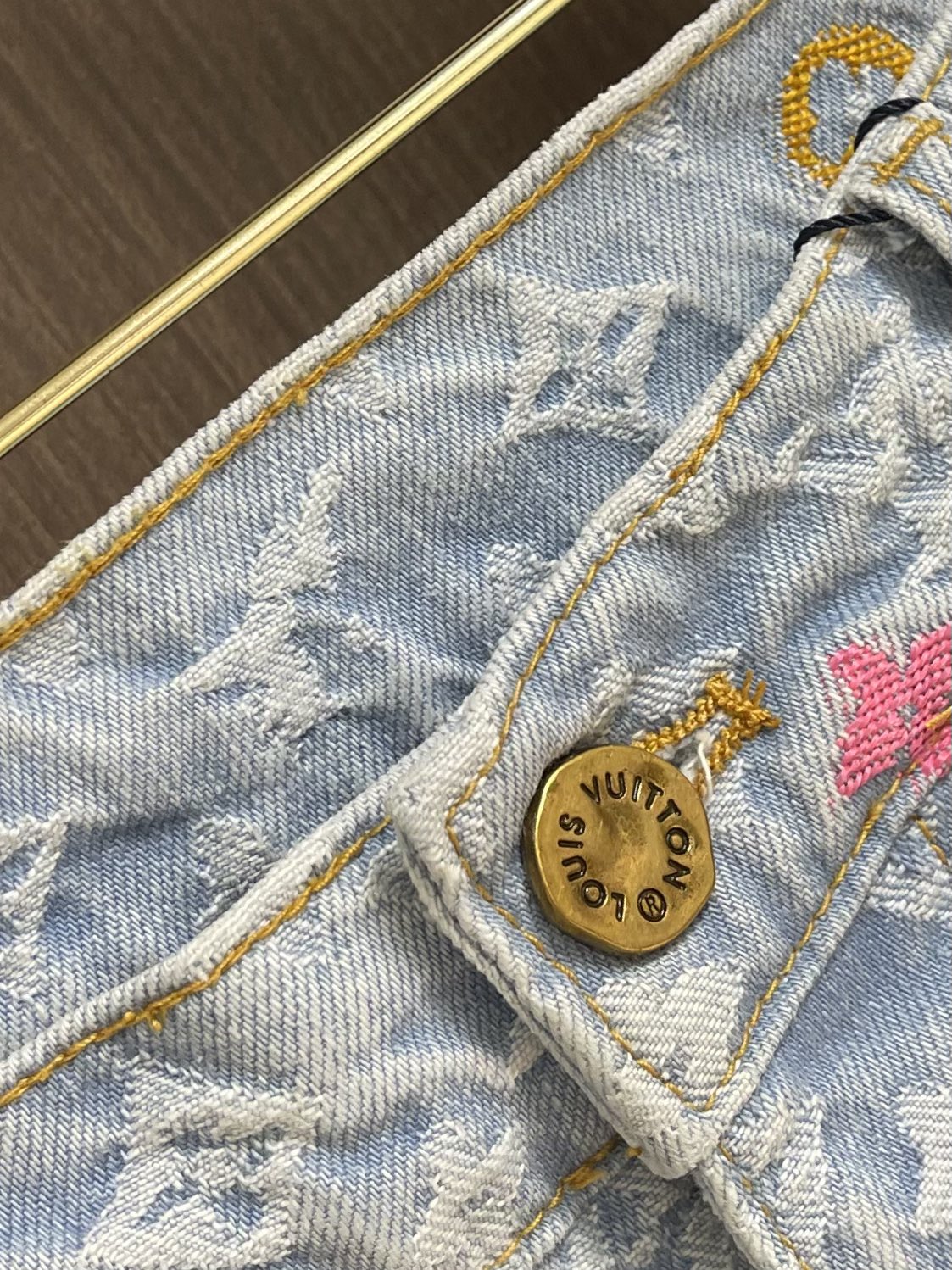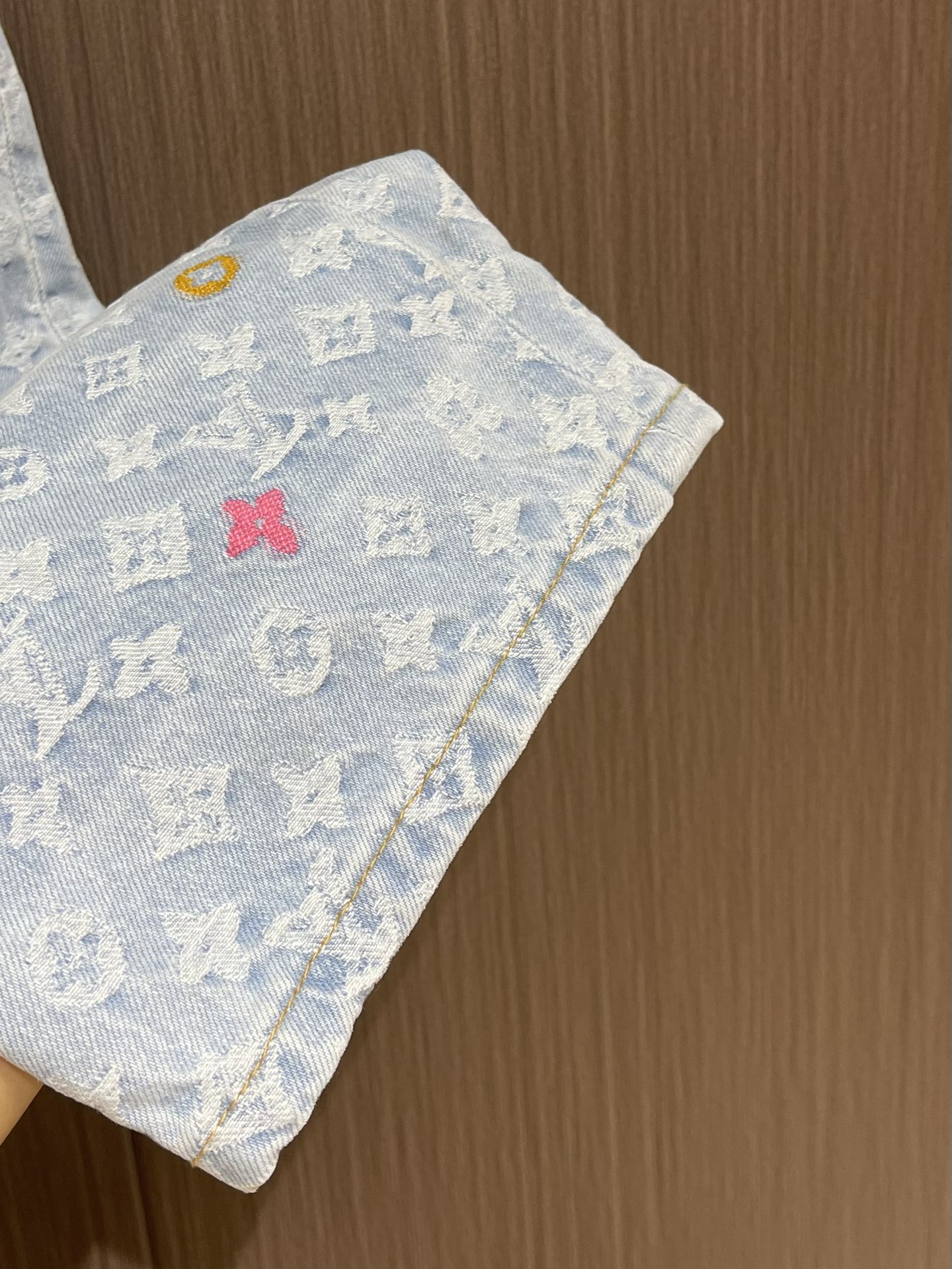 Top and jeans LV 2024ss tyler Collaboration Embroidered Long-sleeved Shirt and Jeans Set, tyler collaboration series. The original version is made of twill cotton jacquard denim material. The size and spacing of the jacquard patterns are the same, and the width of the patterns is consistent, giving it a rich texture. Washed and aged in a retro light blue color, the overall decoration is decorated with old floral patterns. After weaving, it is done with positioning color embroidery (blue, pink, yellow, fluorescent green). Four colors of yarns are adjusted multiple times to achieve perfect color matching. The monogram full logo and macaron candy-colored embroidered logo are both fashionable and high-end in craftsmanship. After the finishing process is completed, it enters the washing water. Spray the horse to make the fabric naturally fade and present a whitening effect. The back waist leather plate features a color-matched iron mold pattern and is made of genuine top-grain cowhide suede. The threshold is equipped with 1 large and 4 small process buckles for opening and closing with baked paint hardware buckles. The back pocket is made of suede color-matched mold suede badges. The entire set of new auxiliary materials is customized simultaneously, with perfect detail processing. Jeans: 30-32-34-36 Denim jacket: 46-48-50-52