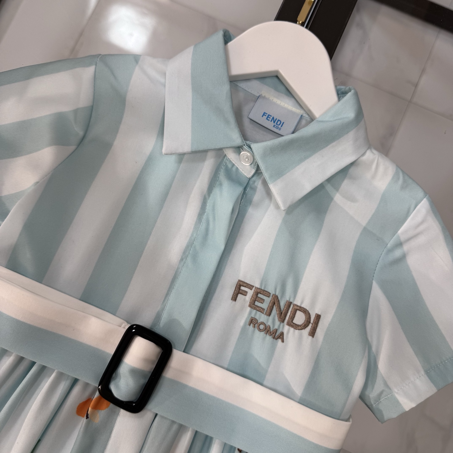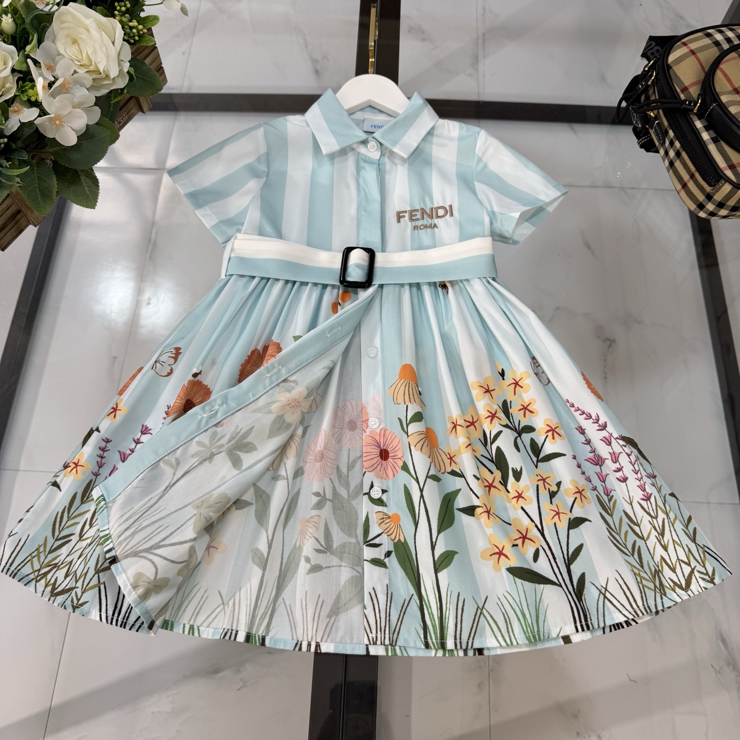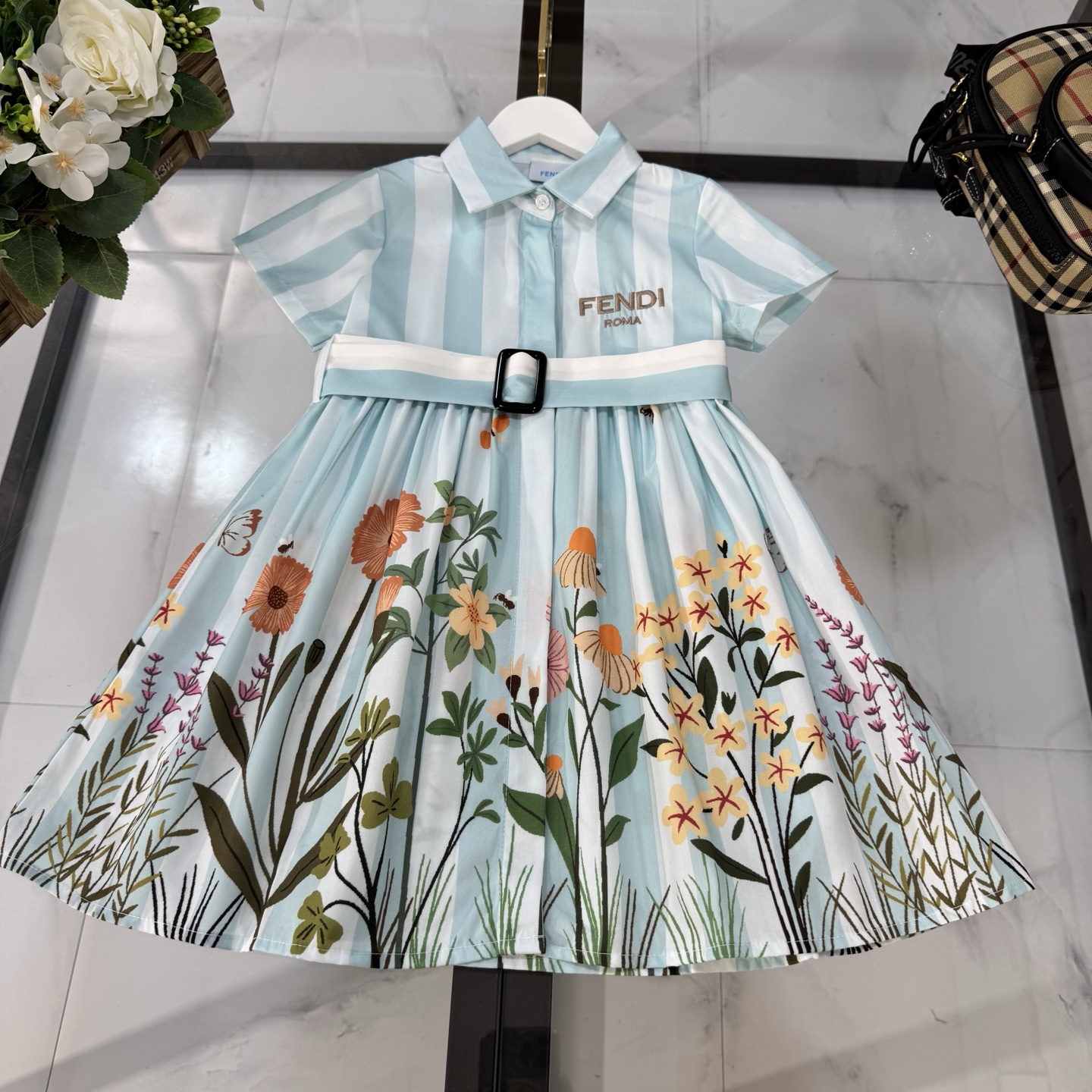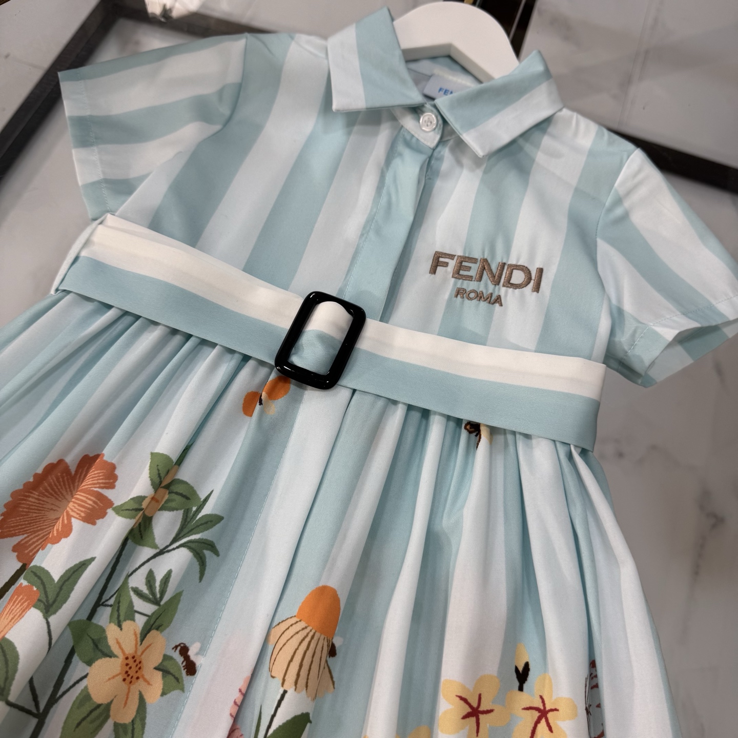 Fendi, high-end children's clothes, girls dress, single-breasted princess dress shirts, thousand goldwind flower design Belt can be closed Classic embroidered logo, upper body comfortable, good-looking, code number: 90/100/110/120/130/140/150/160 cm