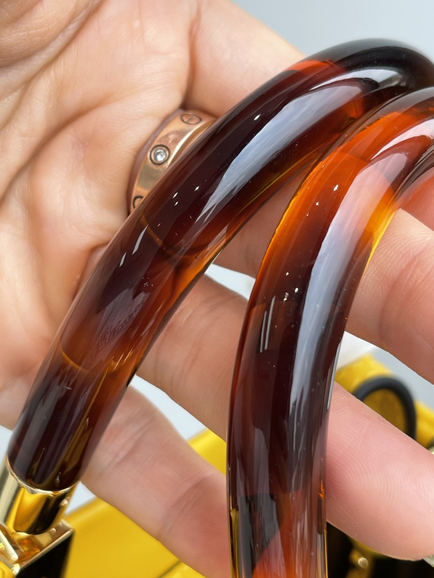 Let's take a look at the hardware details. Pure copper and real gold electroplated hardware. The handle is made of ACRYLIC, which is more resilient and shiny than gum, looks in two colors, gives a very good visual experience, and feels smooth and comfortable, not holding one is hard to describe the feeling in hand ??.