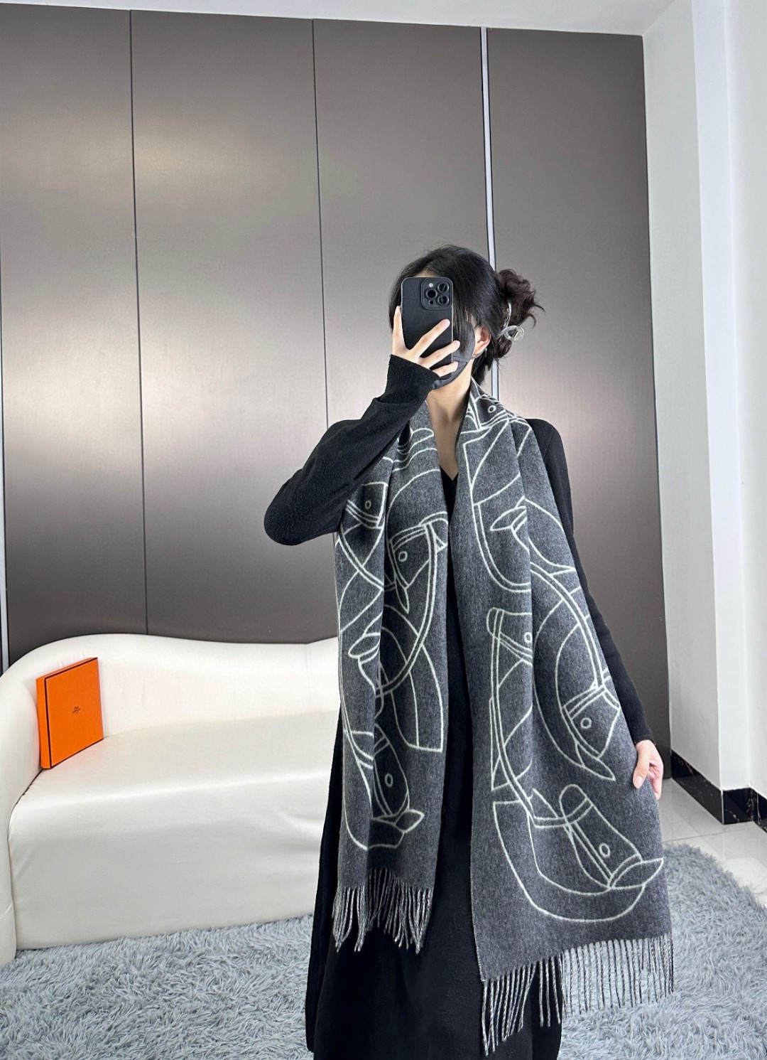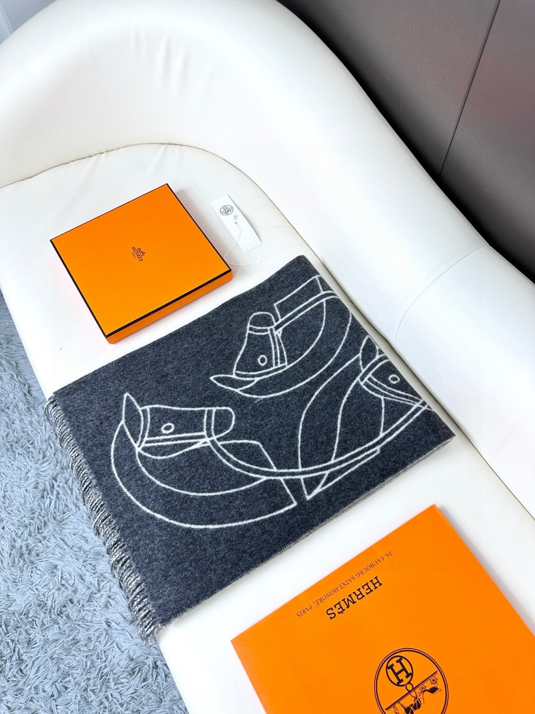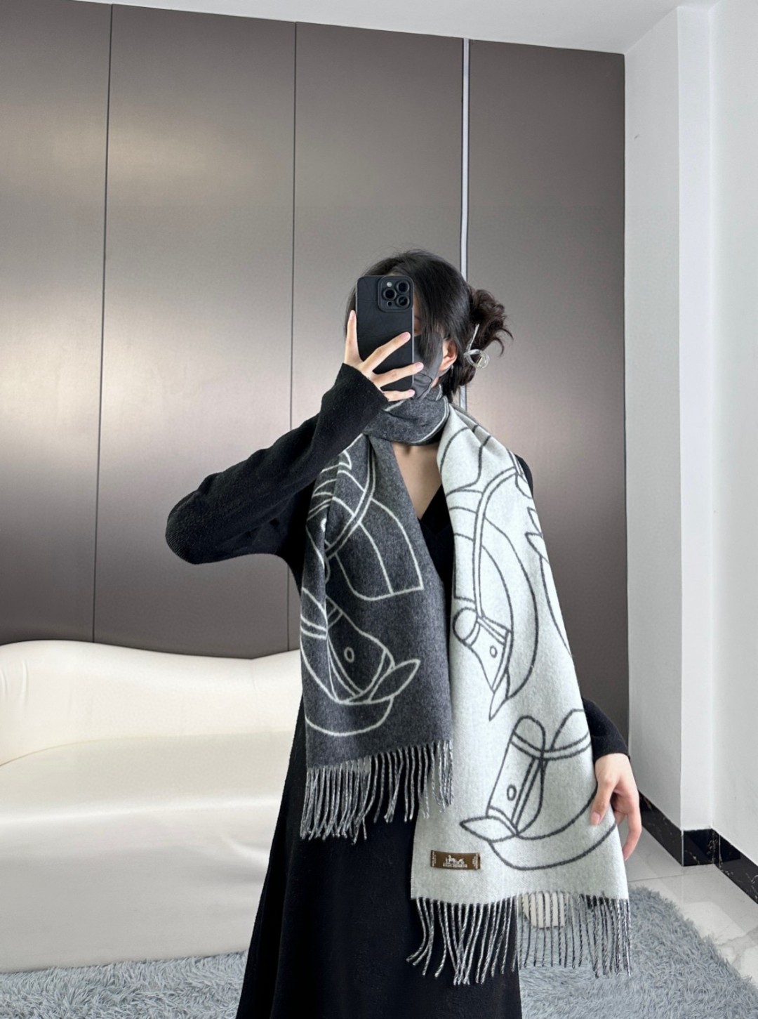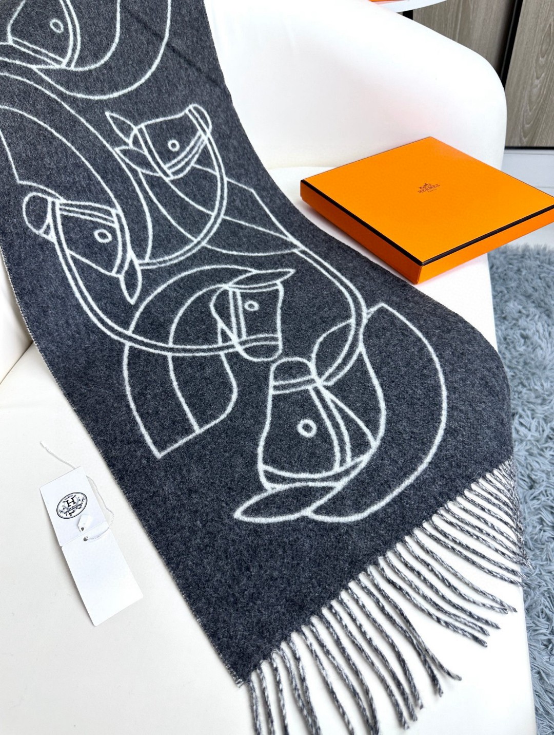 This new Hermes scarf features a delicate color-blocking jacquard weaving, presenting the Entrelacs Equestres horse head pattern designed by Geoff McFetridge. The size is 40*195CM