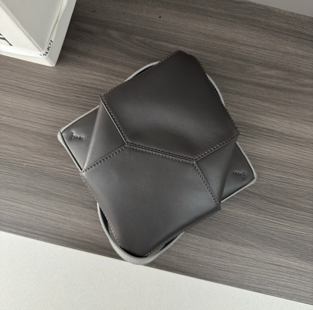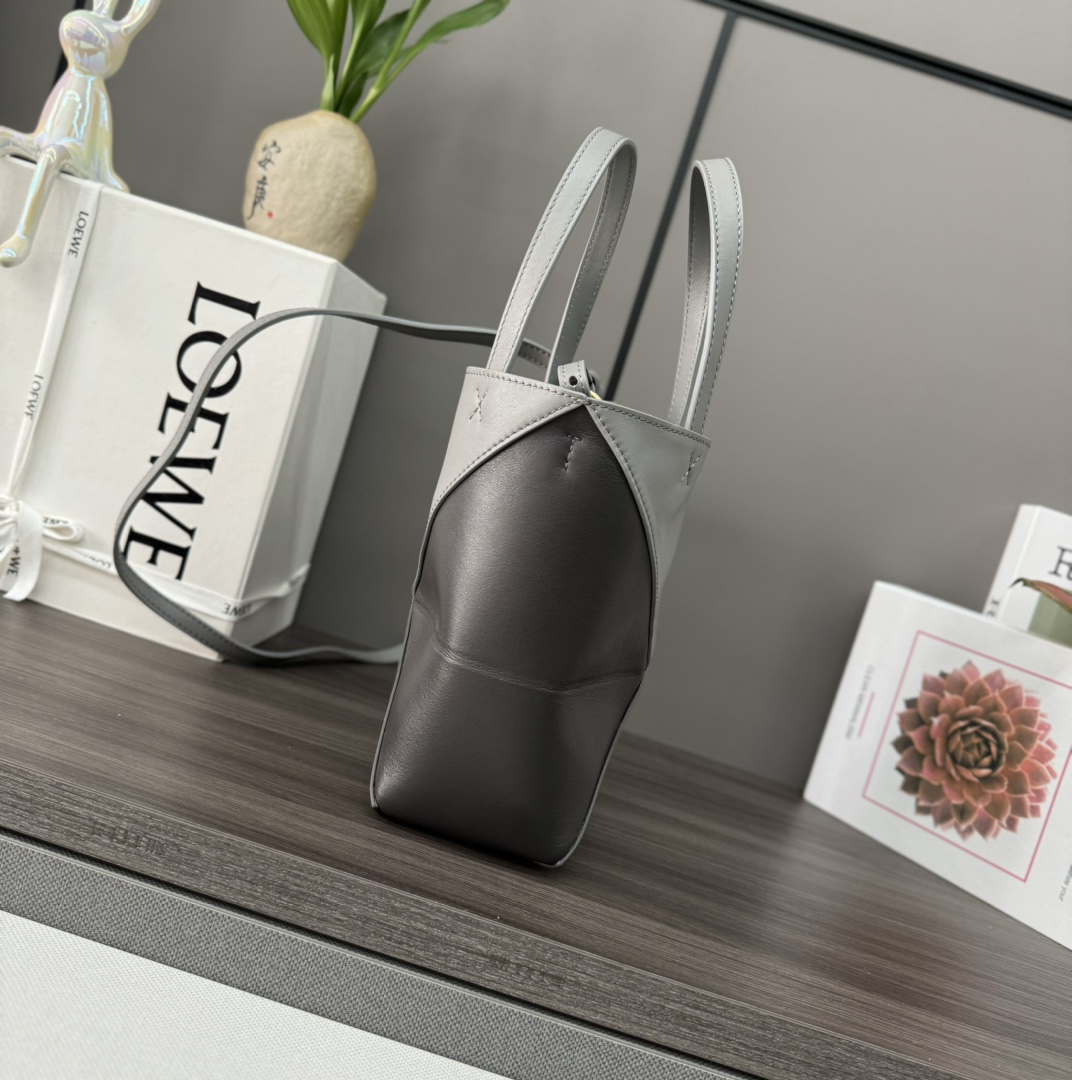 L??w? The new ?? mini ?? two-tone ?? glossy cowhide Puzzle Fold handbag draws inspiration from the geometric lines of the brand's classic handbag collection ?? Reinterpreted with geometric architectural beauty insets, it can be fully folded and is a great travel companion ?? The brand uses creative ingenuity to create a soft and lightweight handbag Pair it with the understated and elegant LOEWE brand logo. This mini two-tone version is made of glossy cowhide and can be worn over the shoulder, crossbody or by hand. It is detachable and adjustable. The shoulder straps are lined with suede and L??w? gilded. Size: 16.5 * 9.5 * 20 cm Model: 052322 (with full package)