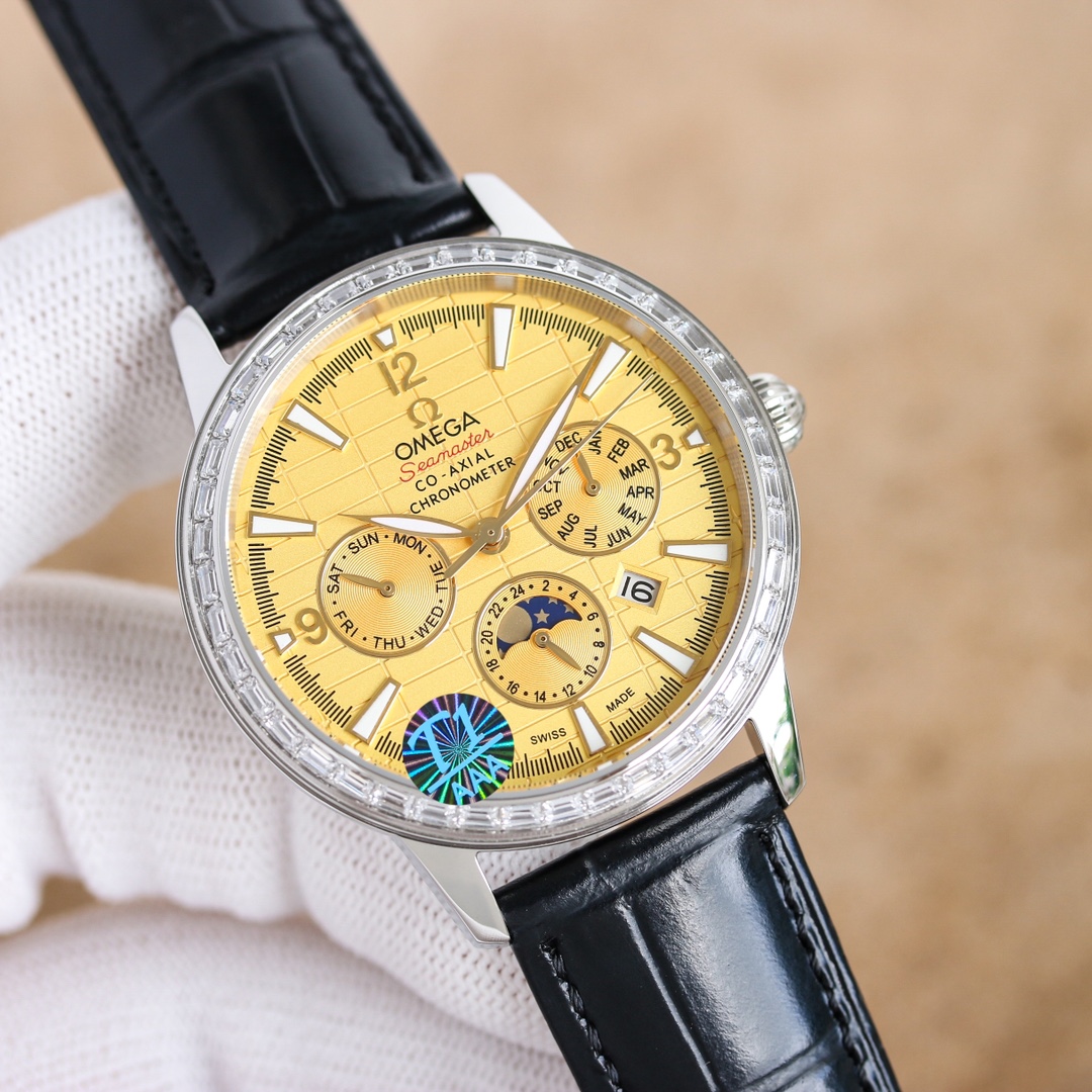 OMEGA Complex Series six-hand Men's Watch [Heart] Bestseller [Heart] multi-functional Wristwatch! 1 ? Mechanical watch with original imported 9100 day-month moon phase kinetic function movement! 2 ? The classic exclusive inner shadow brick on the dial for the hour markers further enhances the elegance of this watch [baring teeth] 3 ? LEATHER strap with imported square scale cowhide! 4 ? Watch crystal with double sapphire crystal! 5 ? Transparent back cover! 6 ? 41mm in diameter, 11mm in thickness! This watch integrates functions such as the day of the week, month, date, moon, and sun into one, making it the true standard for the best men's business watch! It is a representative work of high-end wristwatches! Honorably produced, it enjoys a reputation of noble display. The details reveal the gentleman's nobility, with extraordinary taste. The exquisite craftsmanship is grand and rivals the original product! Consistent inside and out, with unique ingenuity! Welcome to reprint!
