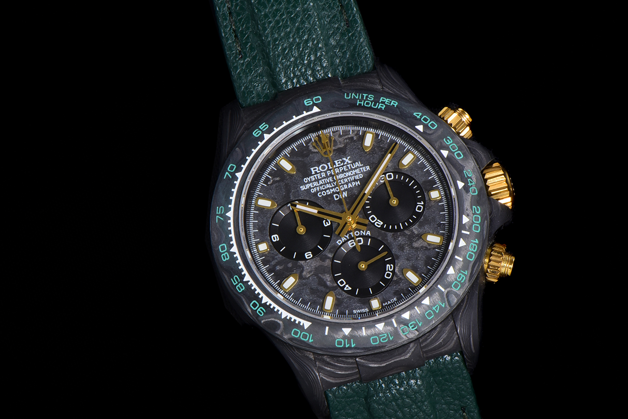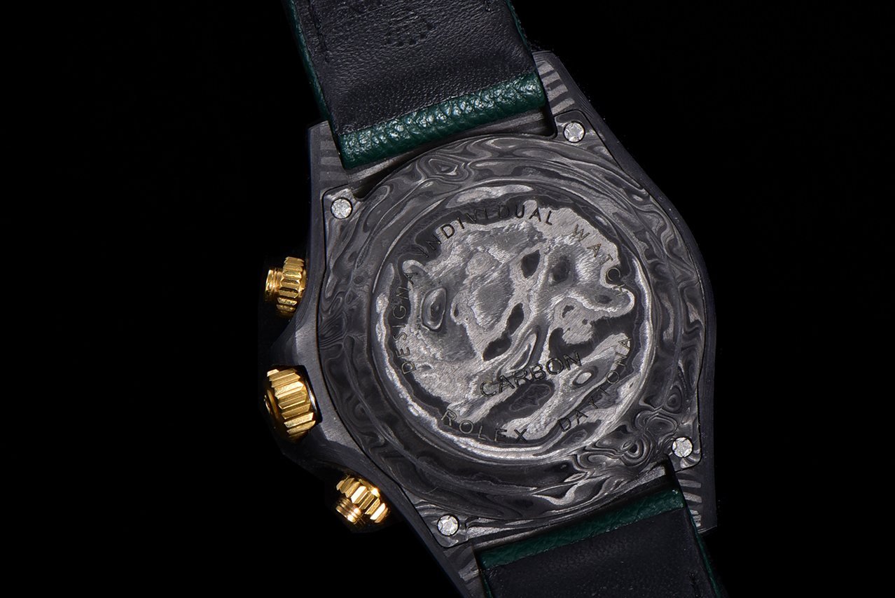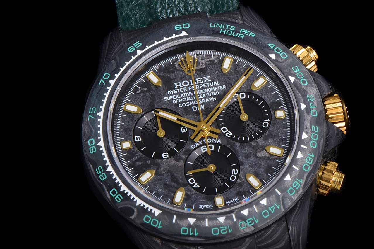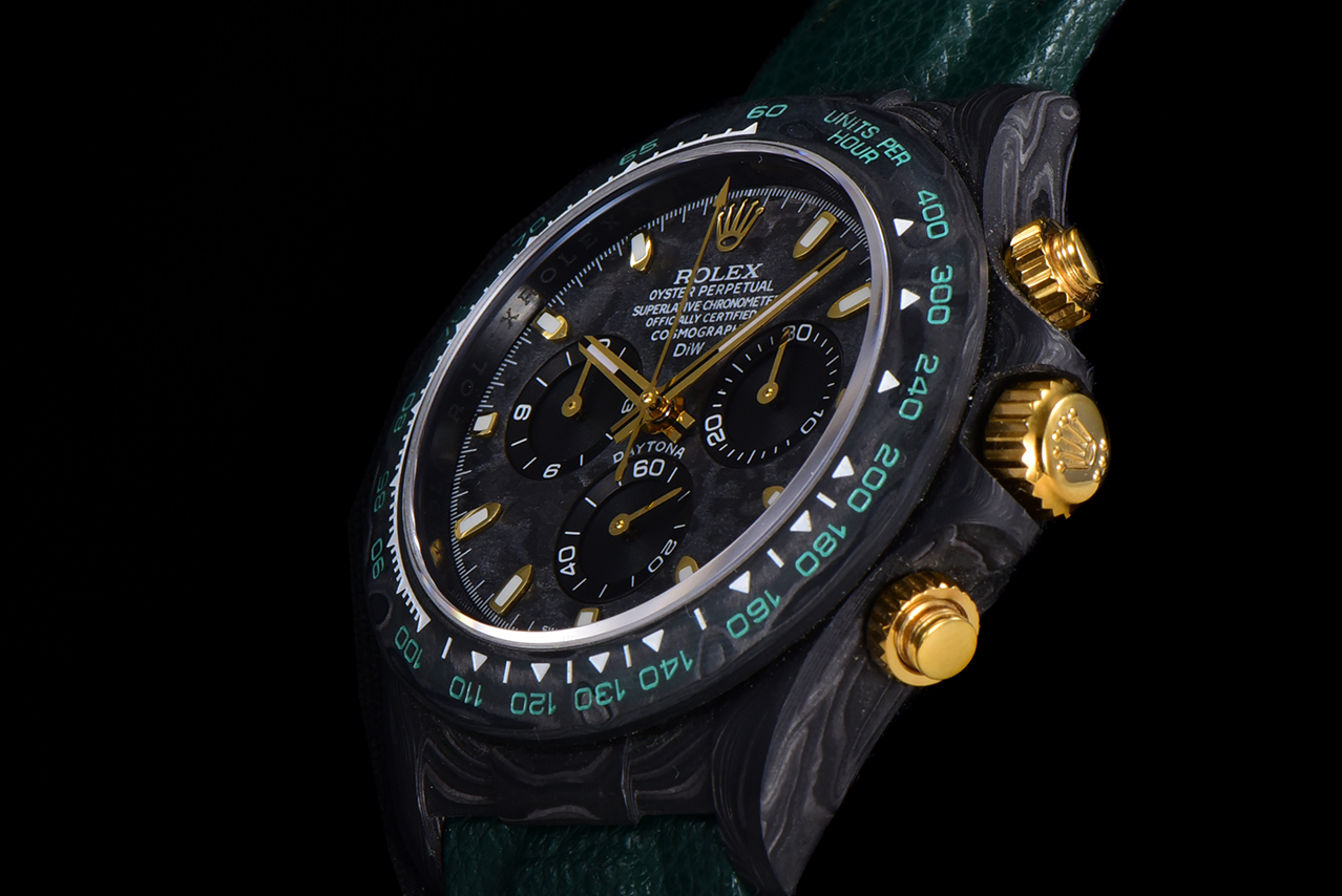 The carbon fiber custom version of the ROLEX Cosmochronograph Daytona series is presented. The watch is not only lightweight to wear but also has a tough appearance. And each wristwatch features a unique carbon fiber pattern.