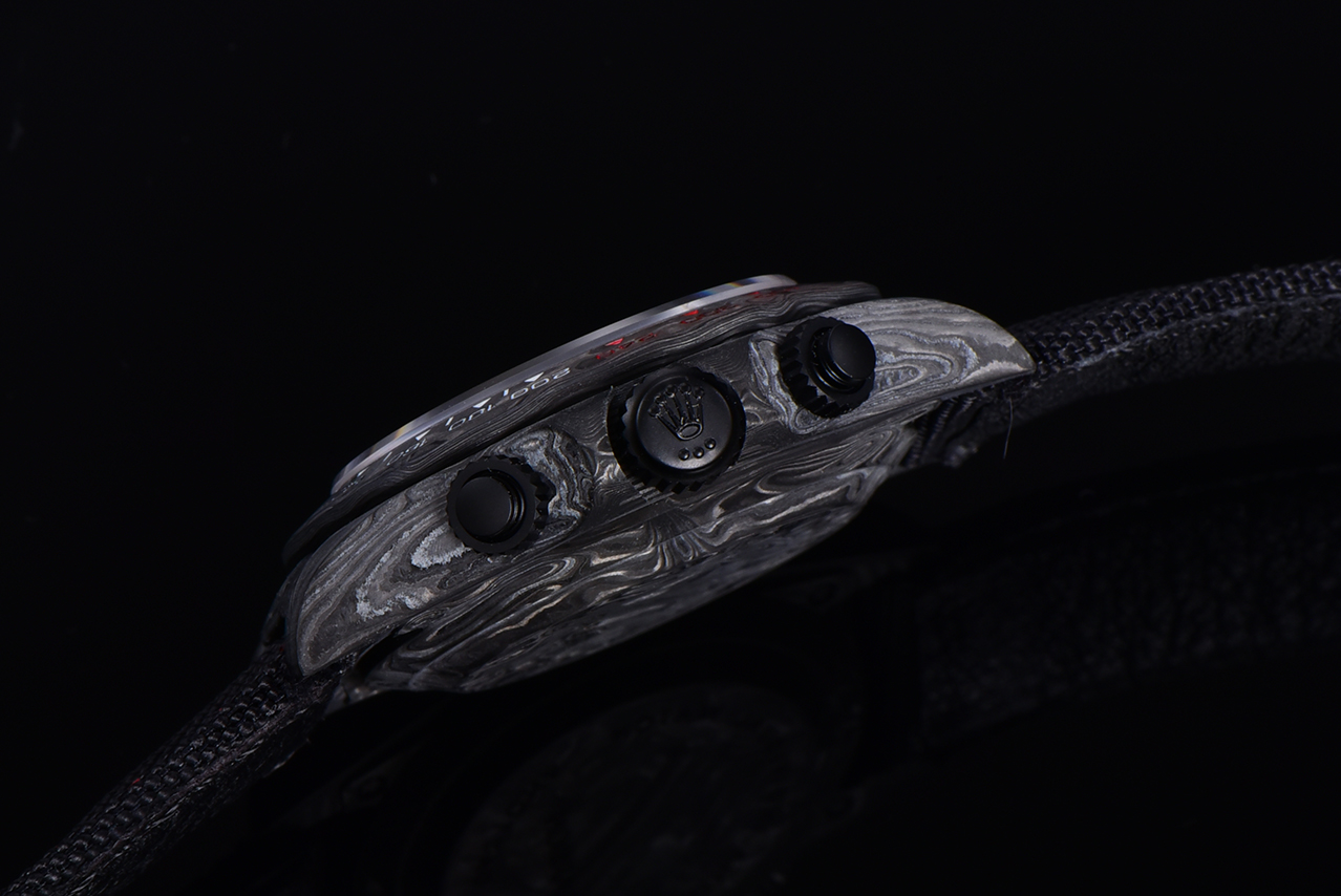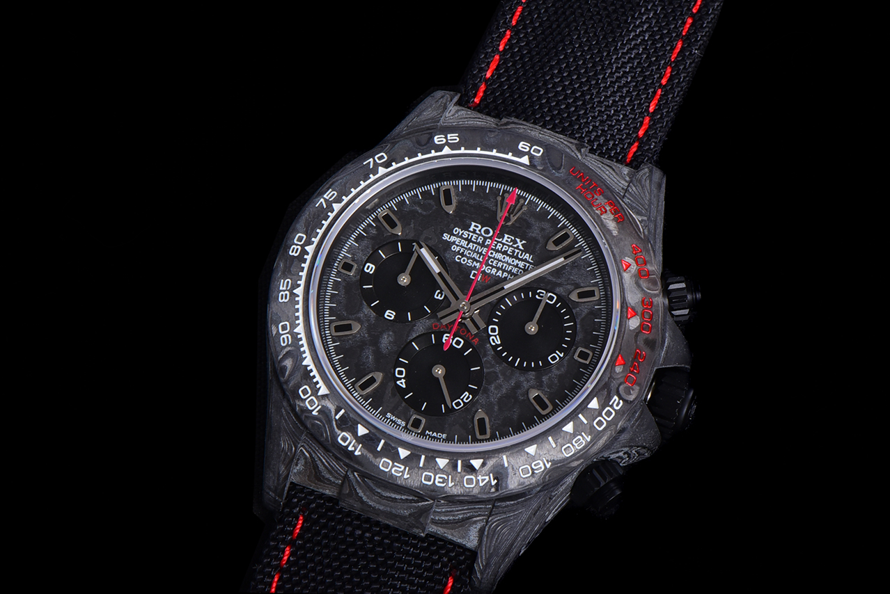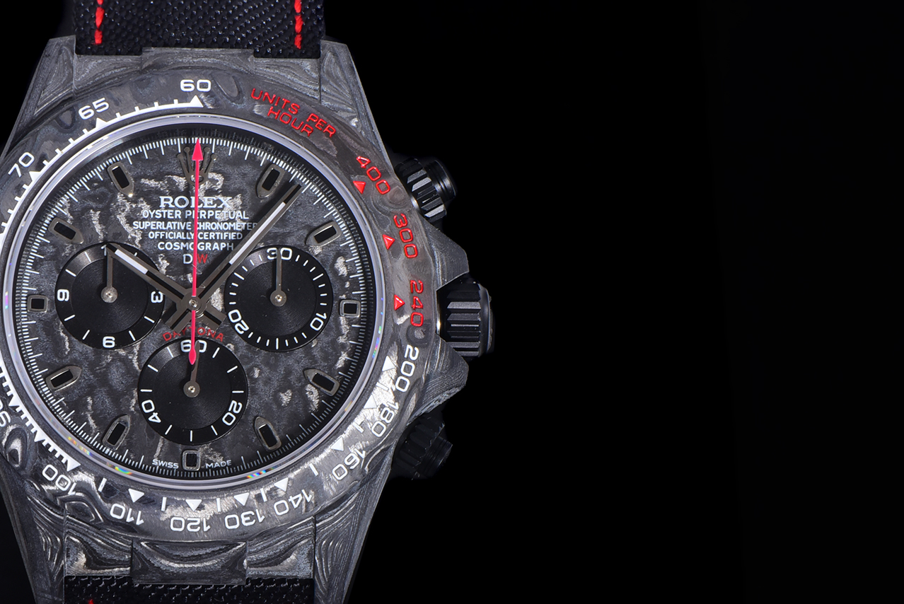 The carbon fiber custom version of the ROLEX Cosmochronograph Daytona series is presented. The watch is not only lightweight to wear but also has a tough appearance. And each wristwatch features a unique carbon fiber pattern.