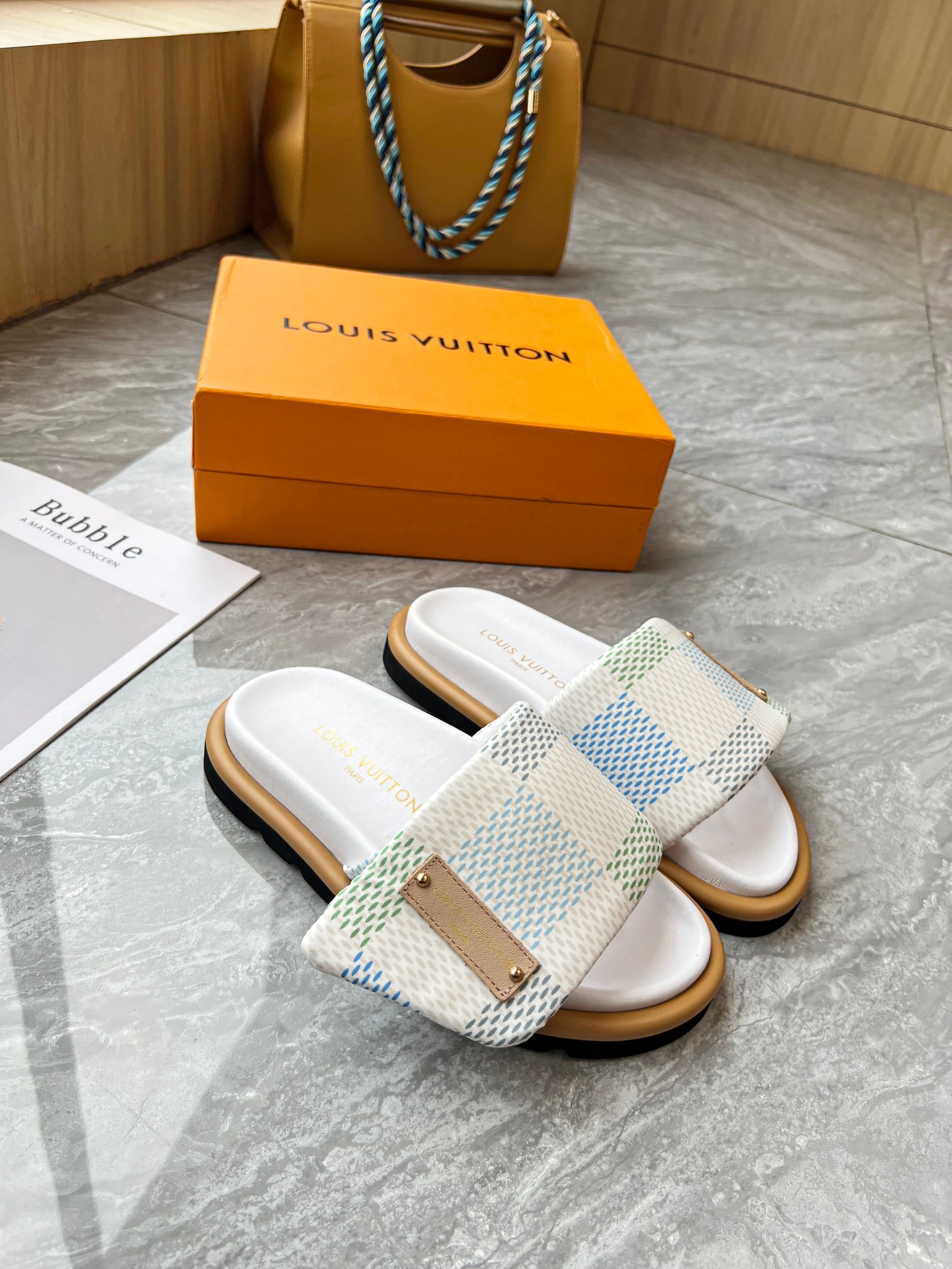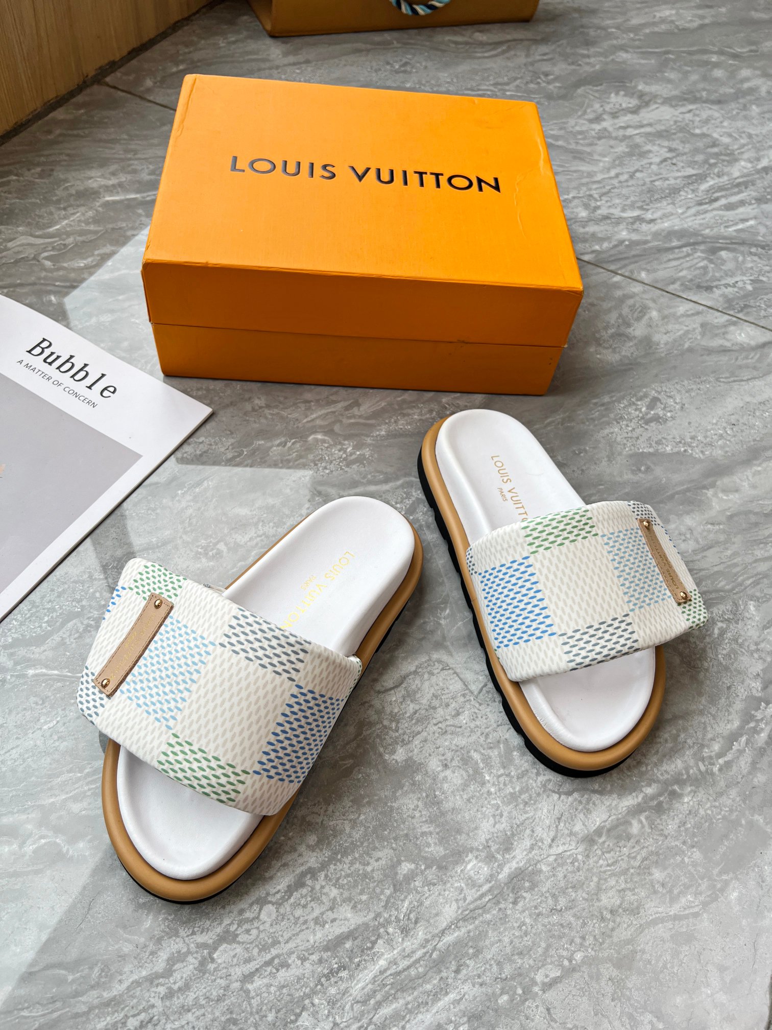 Style #2004??????. L Donkey L Family's best-selling embossed logo patterned flip-flops. This Pool Pillow Comfort flat-bottomed flip-flops is made of technological fabric and reinterprets the Monogram pattern with high-frequency embossing technology. Soft padded upper with adjustable Velcro, comfortable and resilient insole with harmonious color ?? Fabric: Original custom tech fabric ?? Lining: Soft sheepskin ?? Sole: original molded rubber foam outsole ??Size: 35-44 (45.46.47)