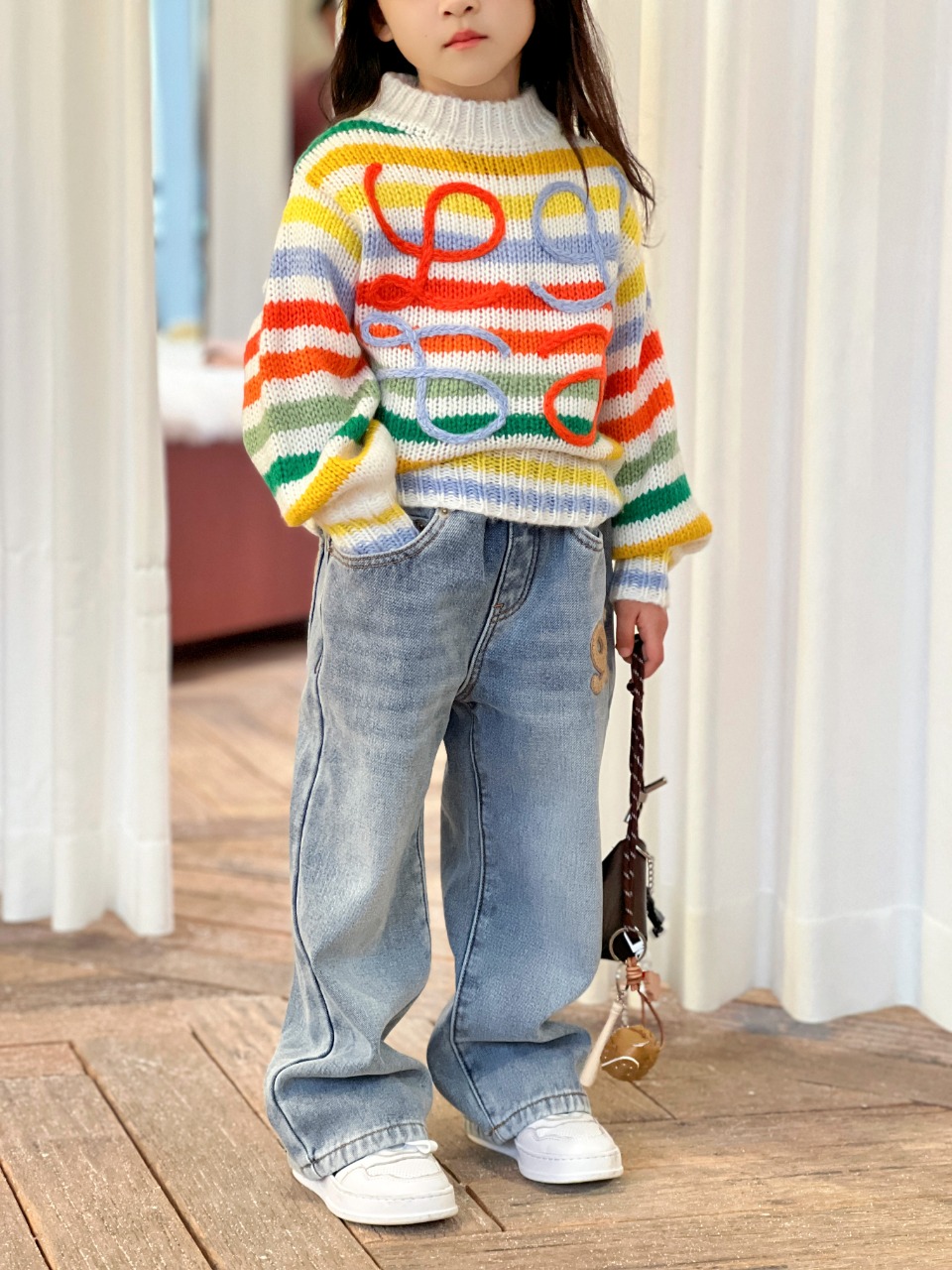LOEWE high-end children's clothing, sweaters for boys and girls, seven-color rainbow sweater with seima hair, bright colors, large Logo woven flowers on the front, made of seima hair acrylic blend yarn, high-temperature environmentally friendly dyeing - good density and flatness, ready-to-wear washing process, sweater thickness: 380 grams, comfortable and good-looking to wear, size: 100/110/130/140/150/160/165 cm, 120